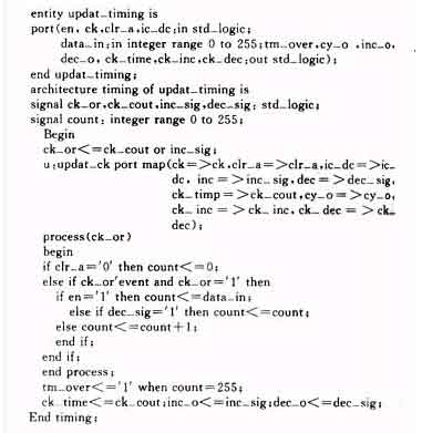 (3)定时模块 主要是将updat_ck模块的输出时钟校正信号inc和dec被校时钟信号timp_ck作为输入,在使能en信号有效时,并行置入定时初始值data_in之后,定时开始,当定时到,输出一个具有一定脉宽的tm_over信号。仿真波形如图2所示。为了简便起见,仿真的Grid size设为2.5μs,定时位数是8位二进制,用计数器count表示。当count=255时,表示定时到,tm_over=“1”。另外,时钟快慢标志ic_dc为“1”时表示被校时钟慢于标准时钟,data_in=FAH;当ic_dc为‘0’,被校时钟快于标准时钟,置入data_in=FCH。VHDL主要原代码如下: